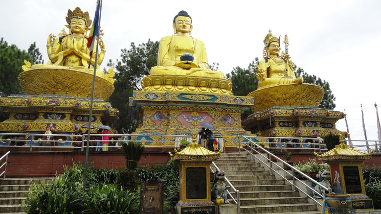 Toen kwamen we bij Boeddha Park bij de Swayambhu Stupa met drie grote gouden Boeddha beelden. In het midden de Amitaba Boeddha van 20.4 m. hoog. Deze voorstelling van Boeddha is het grootste Boeddhistische standbeeld van Nepal. Aan de linkerzijde zien we Avalokiteshvara die 'the Lord who looks down' verbeeld en aan de rechterzijde Padmasambhava, de vrouwelijke Buddha. Deze twee Boeddha variaties zijn elk 19.5 m. hoog.