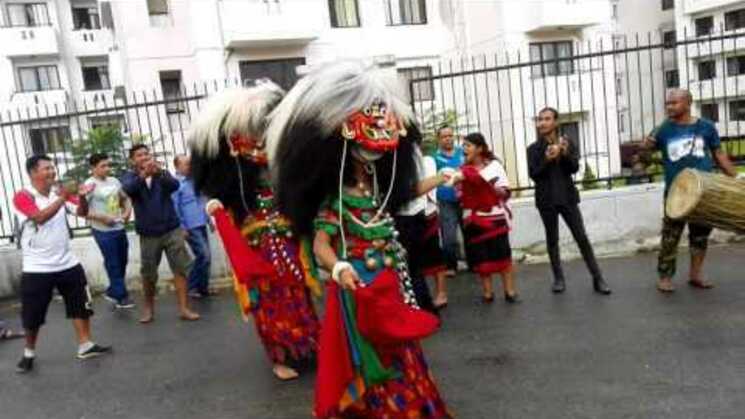 Toen ik gister met de kinderen van school naar huis liep, bleven de kinderen opeens staan. 'We willen kijken, stop!' kreeg ik te horen. Wat bleek nou, midden op straat maakten een aantal mensen zich klaar om een Lakhe dance te gaan uitvoeren. Deze dans is een uiting van goden die boos zijn op de demonen omdat deze de mensen slechte dingen aan doen/willen aan doen. Deze dans zou de demonen verjagen.